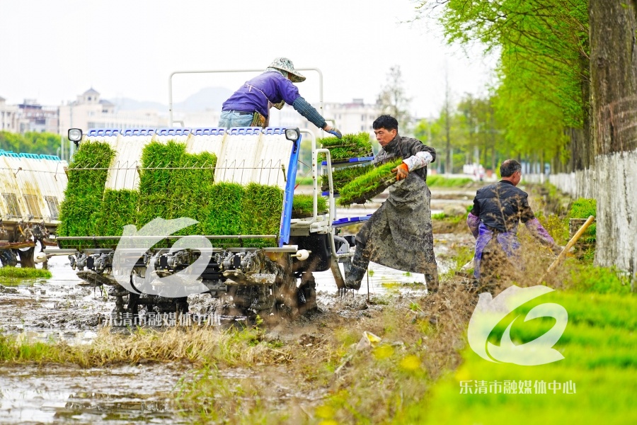 石帆街道贾岙村田间,农户在往自动插秧机里装填秧苗。通讯员 蔡宽元 摄